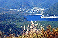樹海のかなたに本栖湖が見える。 西湖はすぐ裏。